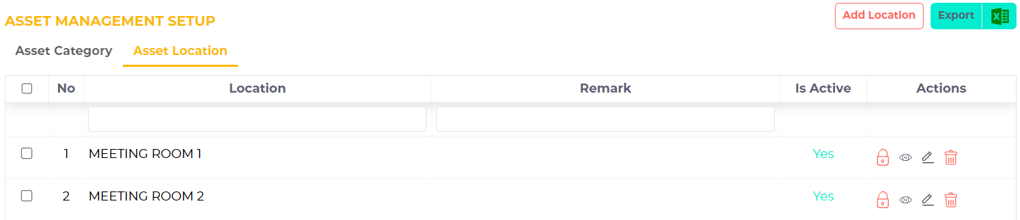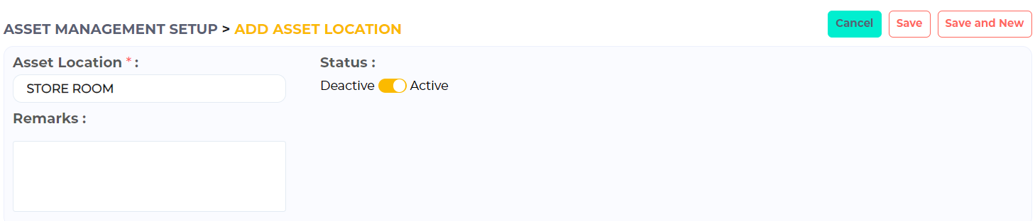 Click Add Location to create your asset location. Enter the Location and put a remark for your reference. Click Save.