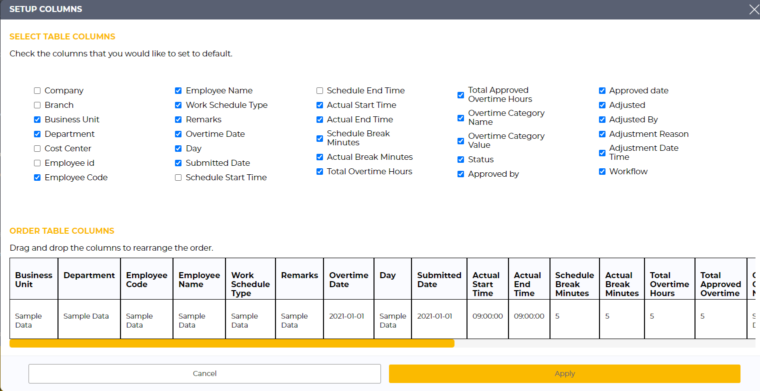 Uncheck the columns that you do not require. There's a preview at the bottom where you can drag and drop to rearrange the column to your desired order. Click Apply once you're satisfied with the report format.